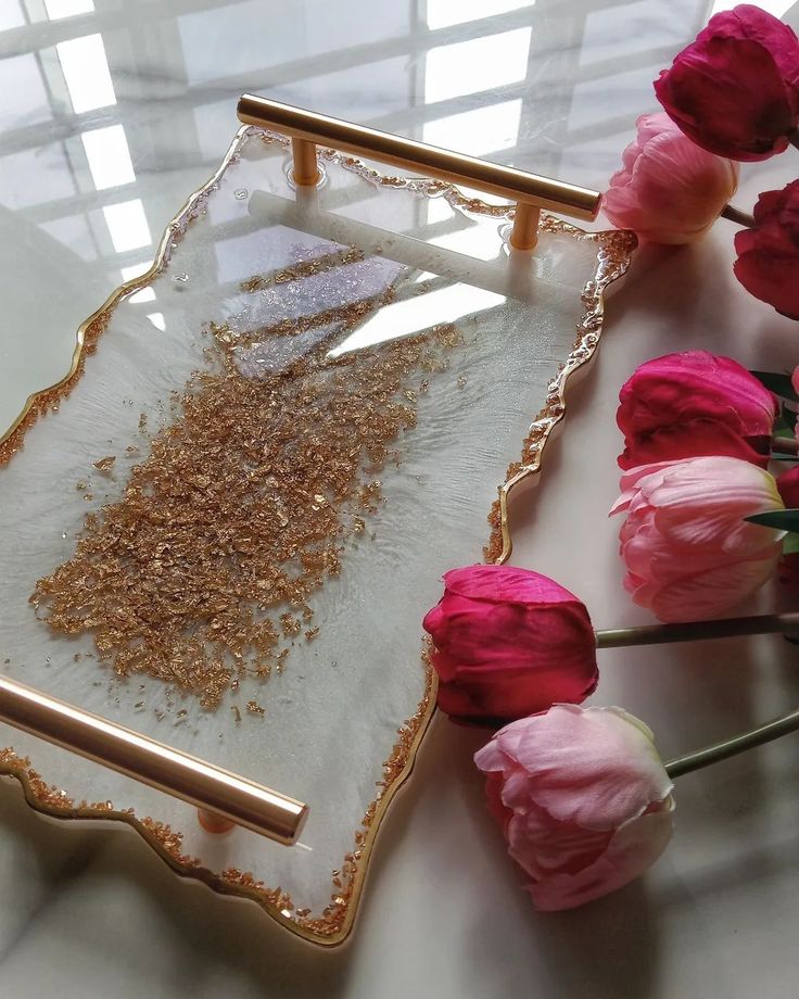 Add a touch of luxury and elegance to your space with this golden warq resin tray. ✨💛